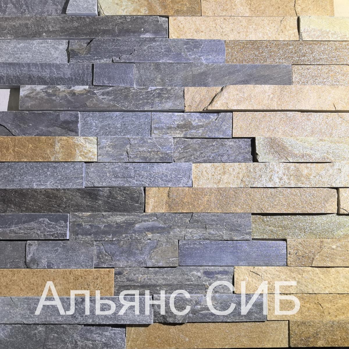 Плитка из натурального камня златолит. Цвет камня: серый, серо-коричневый, желтый, микс. Обработка граней: плитка пиленая со всех сторон, прямоугольной формы, торцованная.